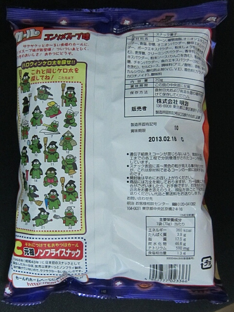 | ★トップ★ 「カール コンソメスープ味」の感想 ◆登録日:2012年09月11日 絞り込み→ 明治製菓 | カール | ハロウィン | 絞り込まない | カテ一覧 |