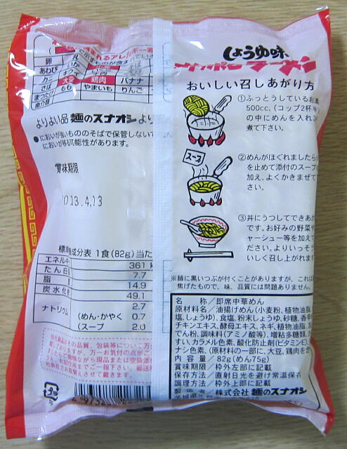 | ★トップ★ 「サッポロラーメン醤油(スナオシ)」の感想 ◆登録日:2012年11月06日 絞り込み→ スナオシ | インスタントラーメン(袋) | 絞り込まない | カテ一覧 |