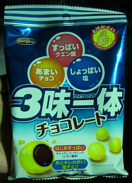 表面はキャンディーコーティングされており、手につかないです。表面は甘酸っぱい味になっており、そのあとチョコの甘味が来ます。