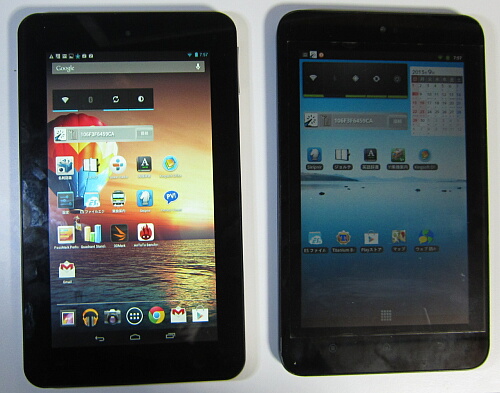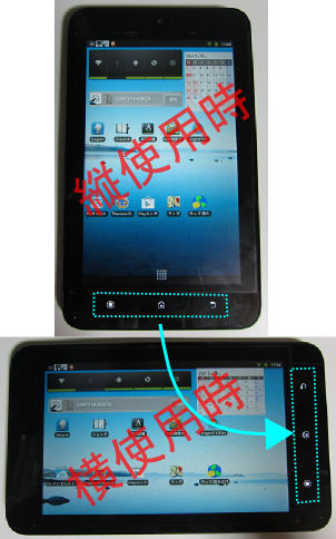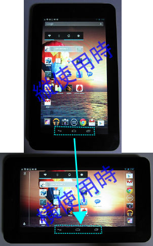 【Android 2.3.3と4.1.1の違い】 Slate 7のOSはAndroid 4.1.1となっていますが、eden TABはAndroid 2.3.3となっています。この辺の差についても記述しておきます。 確実にAndroid 4.xの方が、UIが使いやすくなっていると思いました。一番違うのが、ホームボタン類が画面回転に追従するようになったところ。 Android 2.xの場合、ホームボタン類は物理ボタン(eden TABの場合、タッチセンサーだが)だったので、画面を回転するとボタン位置も回転してしまう。 ![]() Android 4.xの場合、ホームボタン類は液晶内に表示されるようになった。なので、画面を回転しても画面下に位置し続ける。 ※もちろん、物理的なボタンでなくなった分、「押下感が全く無くなってしまうので使いづらい」という意見もあると思いますが、画面を回転させる(更には逆さまで使うことさえ結構ある)可能性があるという事情を考えると、画面に対する相対的なボタン位置が統一されるメリットの方がずっと大きいと感じました。それ以外の部分でも多くの改良が見られました。例えば、ウィジェットを呼び出しやすくなっていたり、タスク切り替えがやりすくなったりと、2.xの時に気が付きにくかったり使いづらかった部分がきちんと改良されている感じがしました。かと言ってOSが重くなったりというデメリットは全く感じられませんでした。なので、2.xと4.x、どちらが使いやすいかと言ったら、確実に4.xだと思いましたね。 OSのバージョンの違いが買い替えの動機になる程かというと微妙ではありますが、少なくとも新規で買う場合は、多少高かったとしてもやっぱり最新の4.xの端末の方が絶対オトクだと思いました。 |