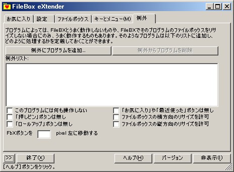 FileBox eXtenderがまれにうまく動作しないことがあるかもしれないので、そのときにはこの例外リストに登録して、個別に制御することができます。