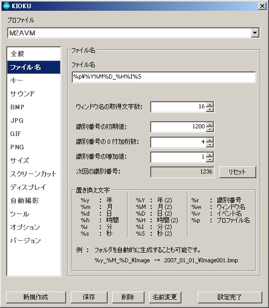 単純な連番で保存することもできますし、各種変数(その時の日時/時間や、キャプチャしたウィンドウ名等)も使えます。