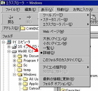 (1) エクスプローラを立ち上げて、「表示」→「詳細表示」に設定。