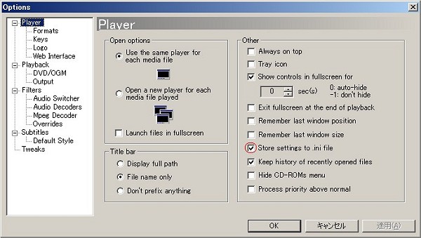 "Store settings to .ini file"のチェックを付けると、MPCがインストールされたフォルダに、mplayerc.iniというファイルが作られます(以降、レジストリではなく、iniファイルでの運用になります)。これの本来の目的は、ユーザ権限などの問題でレジストリへの書き込みが許されない場合でも設定変更ができるようにするためだと思われますが、このファイルを取っておいて新しい環境にコピーし直せば、設定を再現することができます。