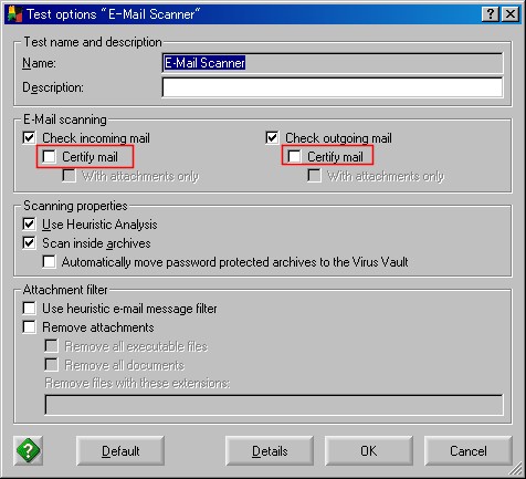 AVGはデフォルトの設定だと、メールのCertify(証明)設定がONになっています。
