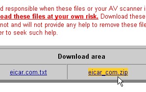 1.まずは、eicarのサイトから、テスト用ファイルをダウンロードします。今回は、eicar_com.zip(圧縮済みファイル)をダウンロードします。