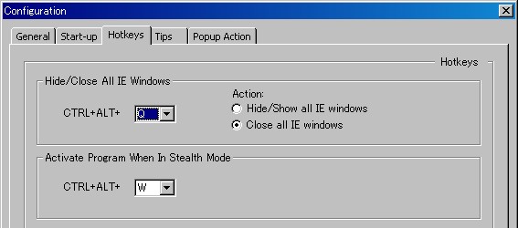 「hotkeys」画面で設定したキー(CTRL+ALT+A〜Zのいずれかを設定できる)を押すことにより、起動しているIEを一発でクローズできます。