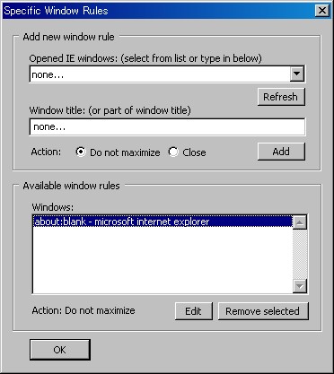 「Window Rules」を設定することにより、ある特定の画面(ウィンドウタイトルが指定したパターンにマッチする画面)だけ最大化しないとか、強制的にクローズするなどの動作定義ができます。
