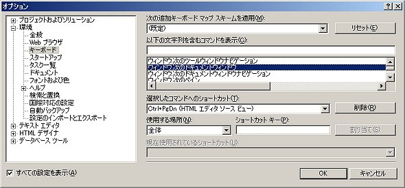 キーアサインの変更画面はお世辞にも使いやすいとは言えません。機能名の説明がない、見通しが悪いなどの難点はありますが、出来ないよりは遙かにまし。