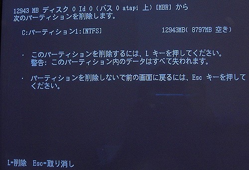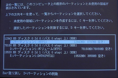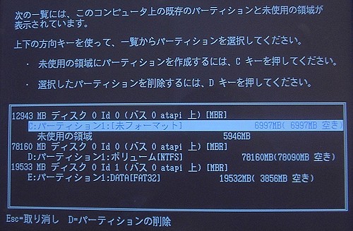 さて、C:を一旦削除しますので、C:を選択した状態(上写真の状態)でDキーを押します。