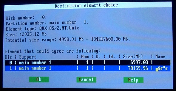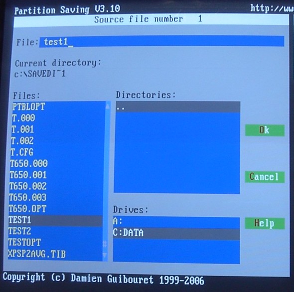 | さて、やっとリカバリができます。 vol.072で作成したDOS起動ディスクから、Partition Savingを起動します。 ![]() Partition Savingが起動したら、Restore an elementを選択。 ![]() ↓セーブしたファイルを指定。 ![]() ファイルを展開するパーティションの選択画面。 ![]() この画面は大事なので詳しく説明しておきます。